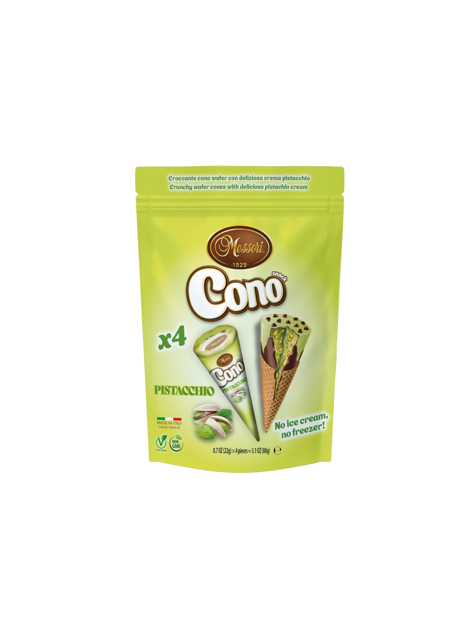 Cornete de vafe cu cremă de fistic (40%), bucățele de ciocolată neagră (9%) și orez expandat (7%).