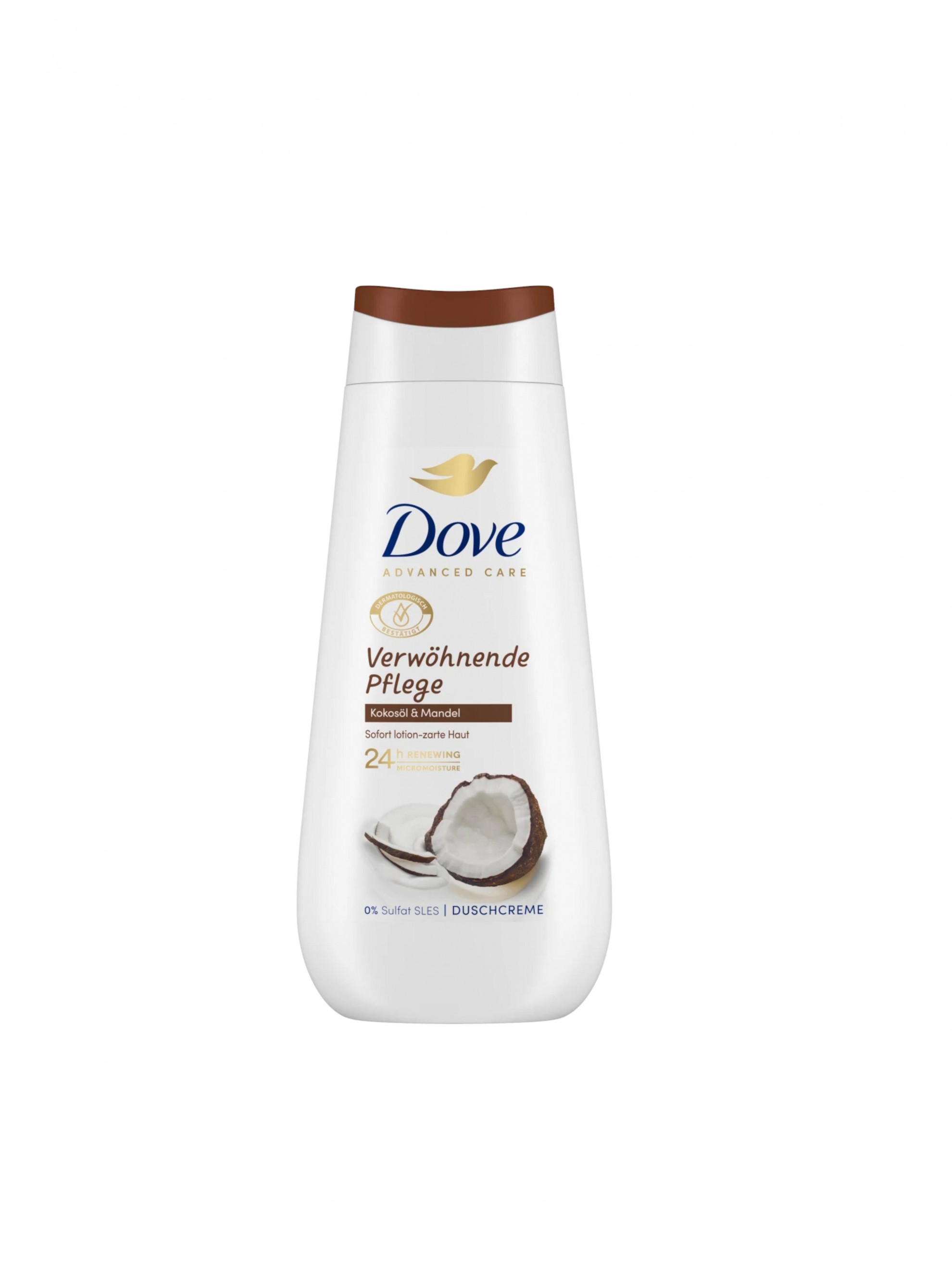 Crema de duș cu ulei de cocos și migdale de la Dove este deosebit de blândă cu pielea.