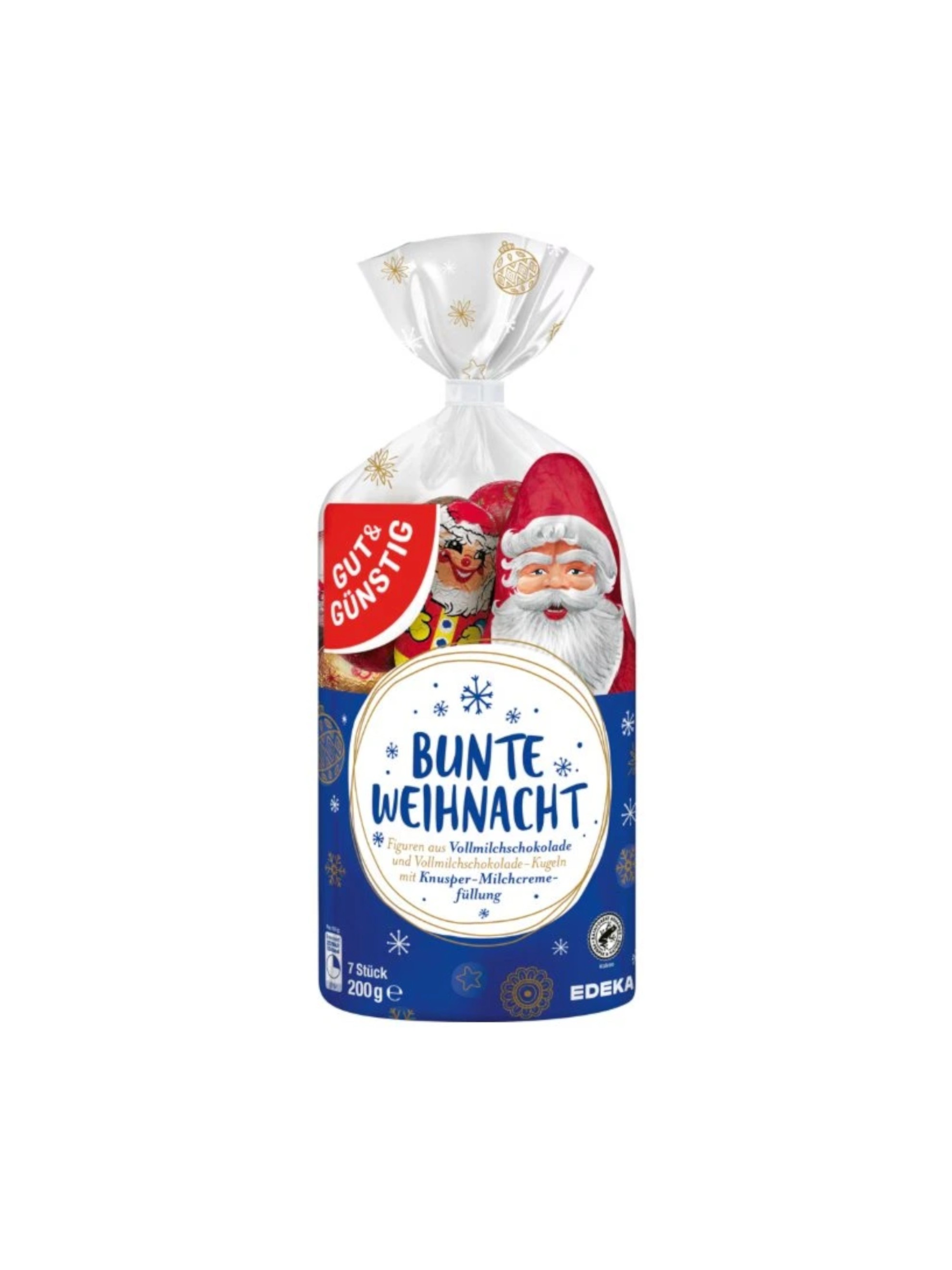 Pachetul conține 7 bucăți de figurine ciocolata - Moș Crăciun vesel din ciocolată, globuri și bile într-un pachet frumos și colorat.