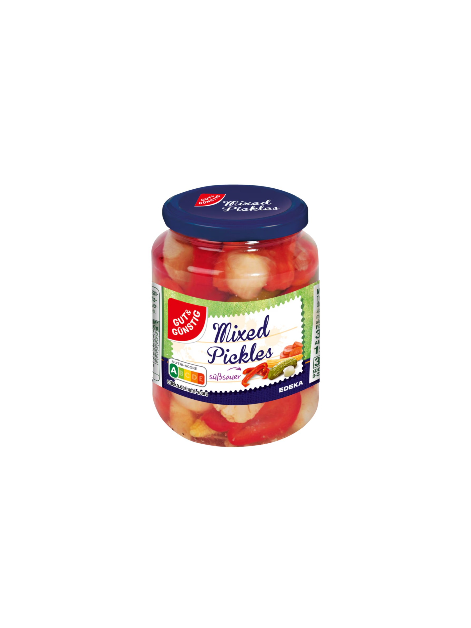 Ingrediente: 40 % legume (castraveti, conopida (metabisulfit sodiu), ceapa argintie), apa, 17 % legume (ardei, porumb, morcov), zahar, otet, sare.