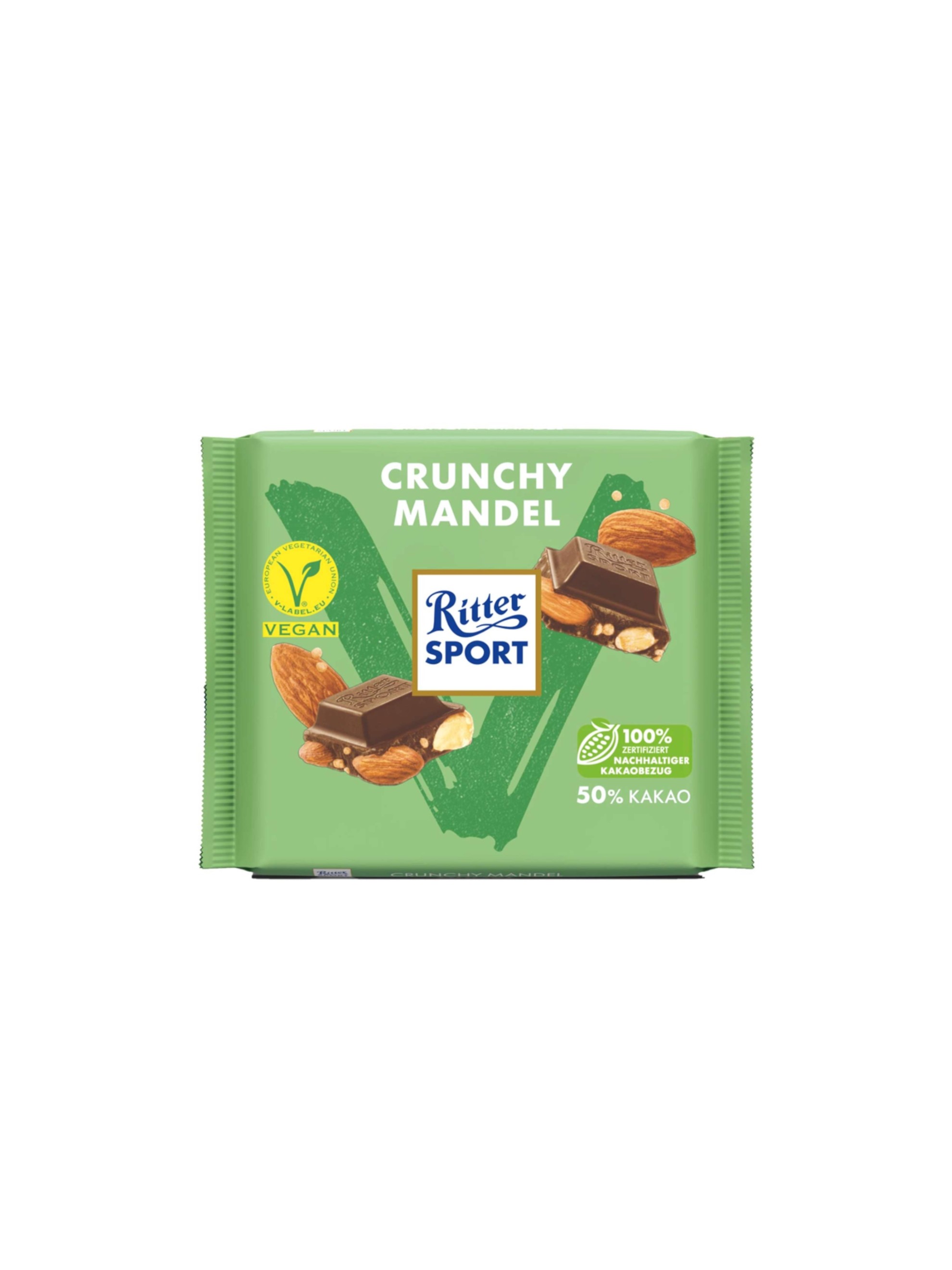 Ritter Sport Vegan Crunchy Mandel este o tabletă de ciocolată pe bază de plante, făcută cu ciocolată vegană fină și bucăți crocante de migdale prăjite.