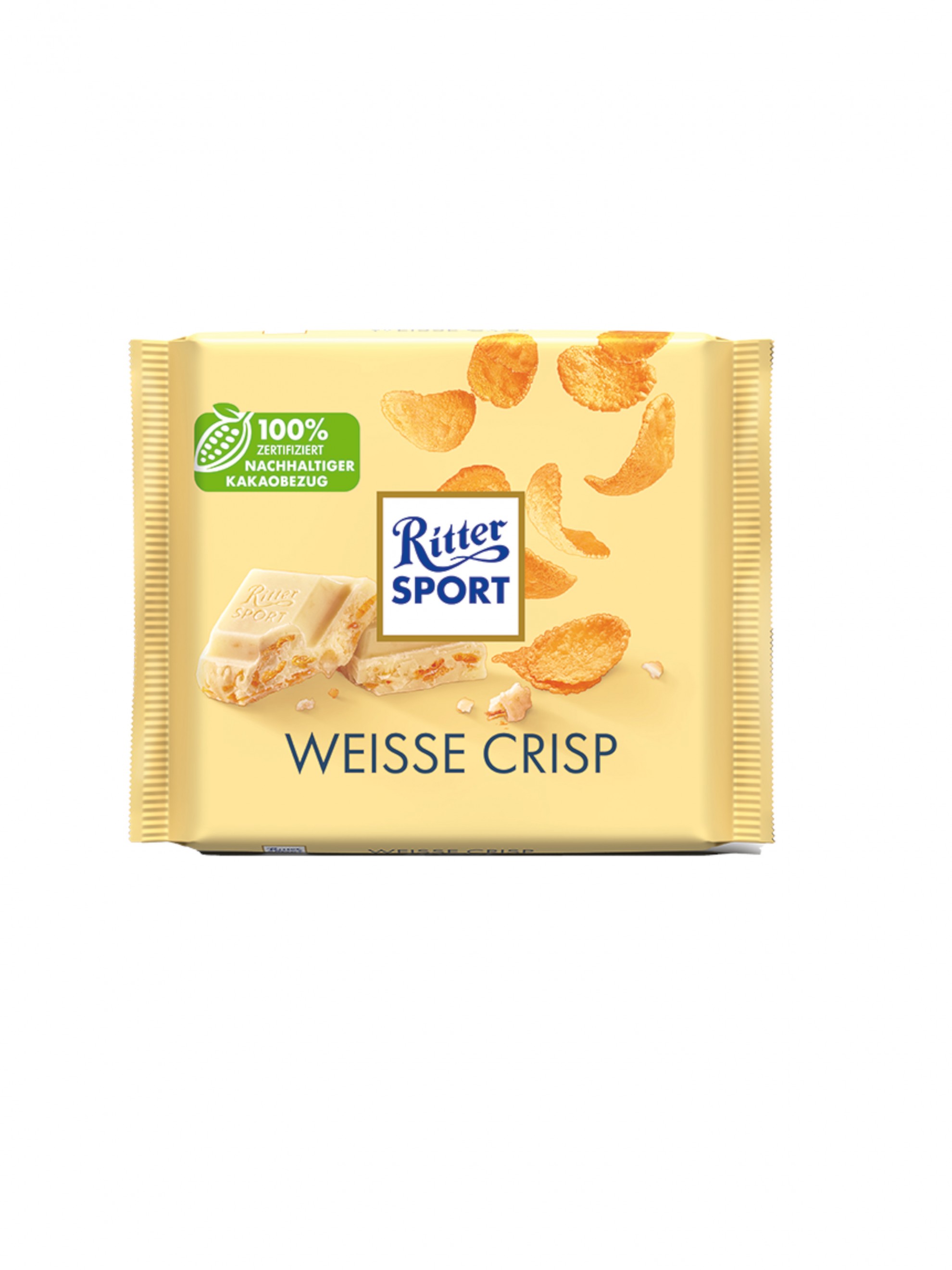Ciocolata alba cu fulgi de porumb (6%) si fulgi de orez (6%).